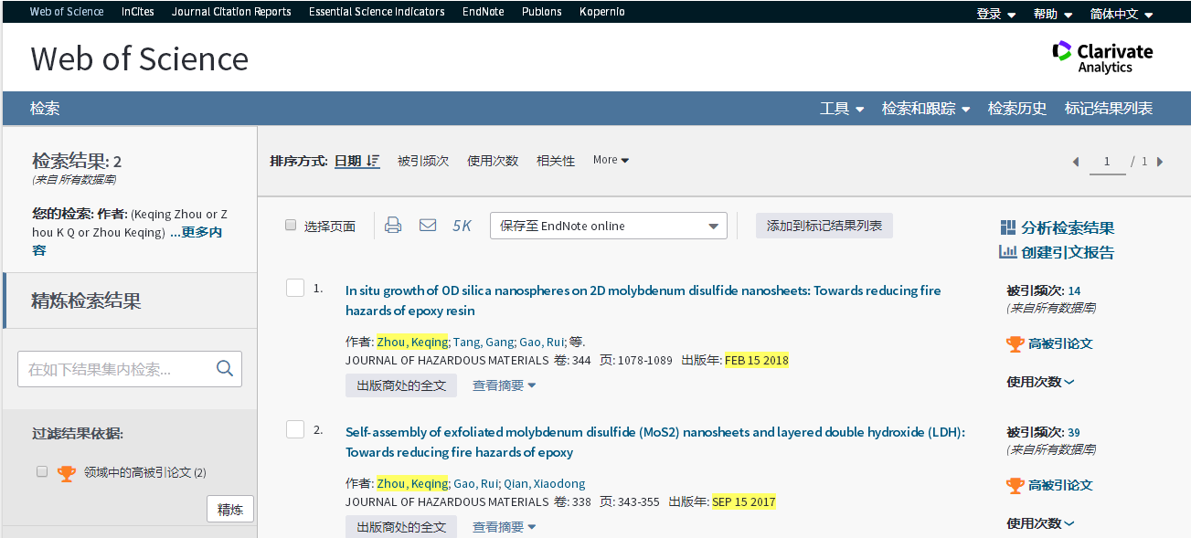 基本科学指标数据库(Essential Science Indicators,简称ESI)最新数据显示,安全工程系周克清老师发表的论文“In situ growth of 0D silica nanospheres on 2D molybdenum disulfide nanosheets: Towards reducing fire hazards of epoxy resin”入选高被引论文。该论文是周克清老师以高清av (武汉)高清av 为第一单位、第一作者和通讯作者身份发表的第2篇ESI高被引论文。2018年7月周克清老师发表的论文“Self-assembly of exfoliated molybdenum disulfide (MoS2) nanosheets and layered double hydroxide (LDH): Towards reducing fire hazards of epoxy”曾同时入选ESI高被引论文和热点论文。