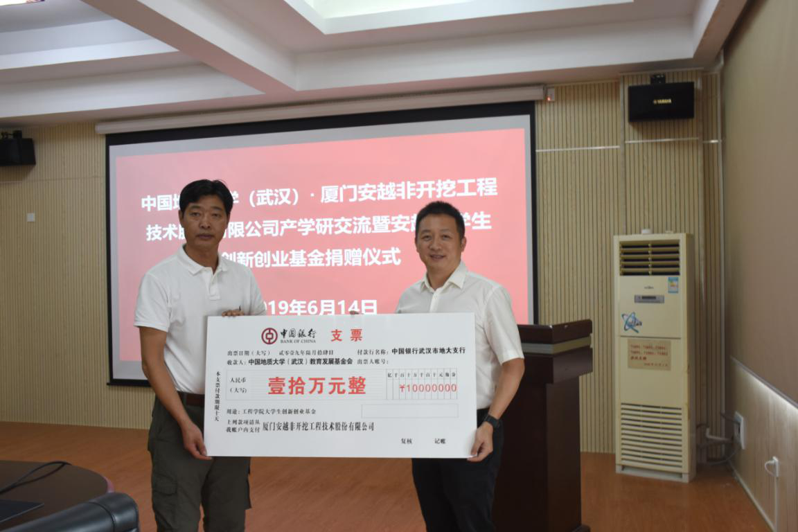 2019年6月14日上午,厦门安越非开挖技术股份有限公司来校作产学研交流,并捐赠10万设立安越大学生创新创业基金,捐赠仪式在315举行。厦门安越非开挖技术股份有限公司董事长廖宝勇一行、武汉中地大非开挖研究院有限公司总经理孔耀祖,校友工作与教育基金管理处副处长吕占峰、丁苗苗,高清av 党委书记陈飞、党委副书记江广长、副教授曾聪参加会议。江广长主持会议。