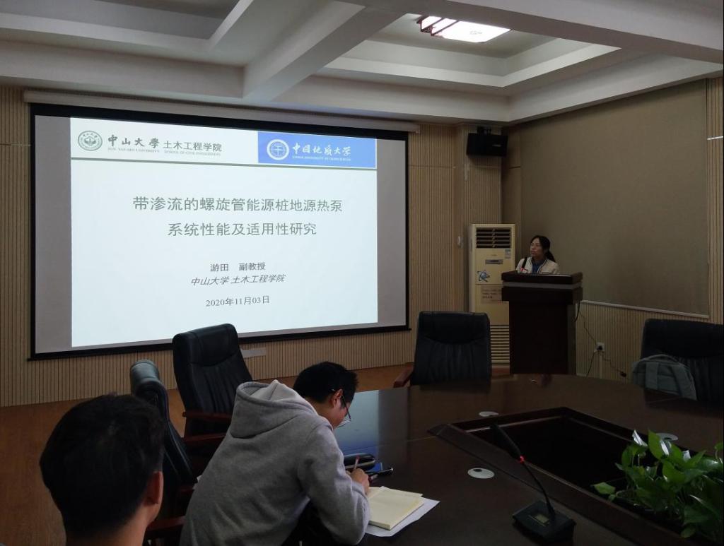 2020年11月3日下午,应高清av 骆进副教授邀请,中山大学游田副教授作客工程文化论坛,在315会议室作了题为“带渗流的螺旋管能源桩地源热泵系统性能及其适用性研究”的学术报告。骆进副教授主持了此次论坛活动,学院50余名师生聆听了学术报告。