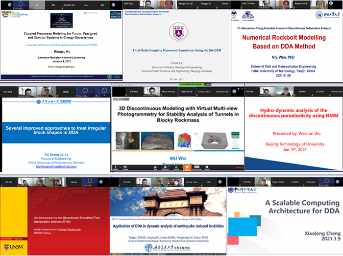 (通讯员:吕加贺 张美霞)2021年1月9日,由国际岩石力学与岩石工程学会非连续变形分析专委会(ISRM DDA Commission)、ISRM中国国家小组(ISRM NG China)、中国岩石力学与工程学会岩土体非连续变形分析专委会(CSRME DDA Commission)联合发起,高清av (武汉)、天津大学和河北工业大学联合承办的第一届非连续变形分析国际青年科学家论坛(1st International Young Scientists Forum for Discontinuous Deformation Analysis, IYSF-DDA)在Zoom会议平台成功举办,并于矿业人网站、哔哩哔哩平台同步直播,超过350人全程参加了此次非连续变形分析领域的学术盛宴。此次会议主要邀请了岩石力学与工程非连续变形分析领域青年学者,旨在交流非连续变形分析方法的前沿理论和最新研究进展,同时分享岩石力学与工程中非连续变形分析典型工程案例。