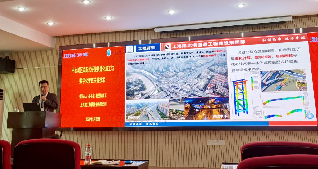 (通讯员 梁荣柱)2021年5月23日下午,应高清av 院长焦玉勇教授和梁荣柱副研究员的邀请,上海建工集团股份有限公司工程研究总院副院长、高清av (武汉)兼职教授吴小建教授级高级工程师作客2021年第8期工程文化论坛,作“中心城区装配式桥梁快速化施工与数字化管控关键技术”专题报告。高清av 副院长窦斌教授代表学院对吴小建教高的到来表示欢迎,并介绍了吴小建教高的基本科研和工作履历。讲座由梁荣柱副研究员主持,约一百名师生参与报告会。