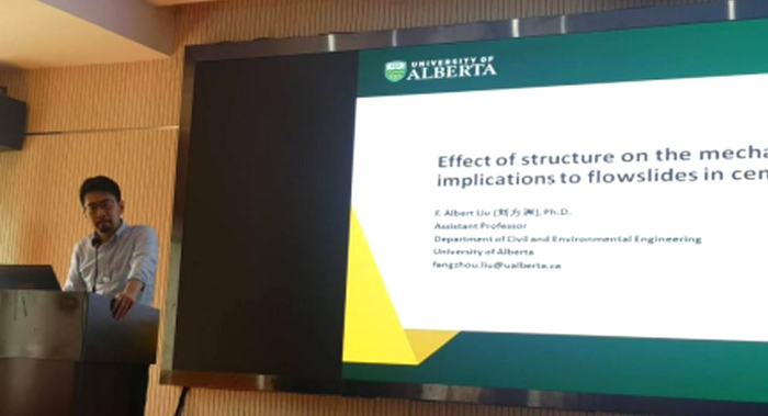 刘方洲博士以“结构性对胶结土中流动滑移形成的影响:以中国黄土为例”为题,分析了结构性对胶结土及特殊性土的大-小应变下的土力学行为及流滑液化滑坡破坏形成的影响。以中国黄土为例,通过常规三轴不排水剪实验展现原状与重塑土体形成液化失稳的状态差异,同时通过NorSand本构模型展示原状与重塑土体在相同状态参数下的力学行为差异。表明结构性对土体在低应力条件下可促使液化失稳。报告也通过弯曲原件利用机械波呈现了胶结土在失胶过程中在小应变刚度的变化,从而实时反应胶结土颗粒接触面的微观结构变化。报告同时展示在离心机条件下重塑黄土滑坡的受地下水浸润后的变形过程及静态液化形成条件,通过离心机技术研究黄土静态液化滑坡的失稳机理并探讨土体在排水-不排水剪转换过程中的液化失稳过程。报告指出,黄土作为一种典型的粉质胶结土体,其结构影响对研究其他特殊土体的力学行为、静态液化及坡体稳定性有非常重要的参考价值。