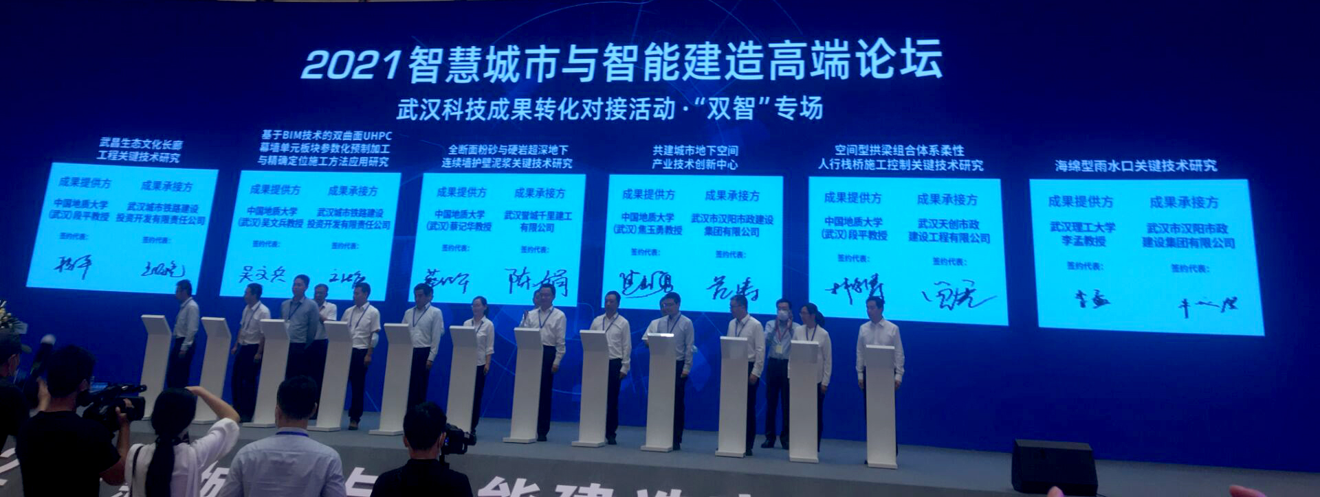 (通讯员:刘浩、张美霞)9月24日,高清av 院长焦玉勇教授应邀率队出席2021智慧城市与智能建造(“双智”)高端论坛。开幕式“武汉科技成果转化对接活动 双智专场”上,焦玉勇带领高清av 蔡记华、吴文兵、林俊涛、刘浩4位老师分别与武汉市汉阳市政建设集团有限公司、武汉市誉城千里有限公司、武汉市城市铁路建设投资开发有限公司签订了共建技术创新中心、人才培养与科技成果转化合作协议。高清av 与武汉市相关部门和企业开展深度合作,将为湖北省“一主引领、两翼驱动、全域协同”的区域发展布局,和武汉建设“宜居城市、韧性城市、智慧城市、绿色城市、人文城市”的重大需求提供技术和人才支持。