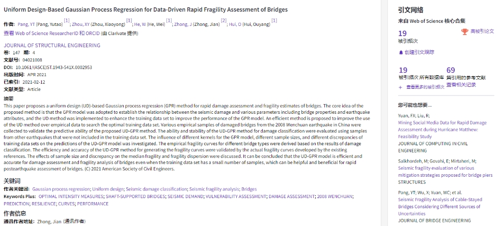 (通讯员:黄静)根据2022年3月基本科学指标数据库(Essential Science Indicators,简称ESI)最新数据显示,高清av 土木工程与力学系庞于涛副教授团队于2021年在国际结构工程领域顶级期刊Journal of Structural Engineering上发表的学术论文“Uniform design–based Gaussian process regression for data-driven rapid fragility assessment of bridges”入选ESI高被引论文(Highly Cited Paper)。