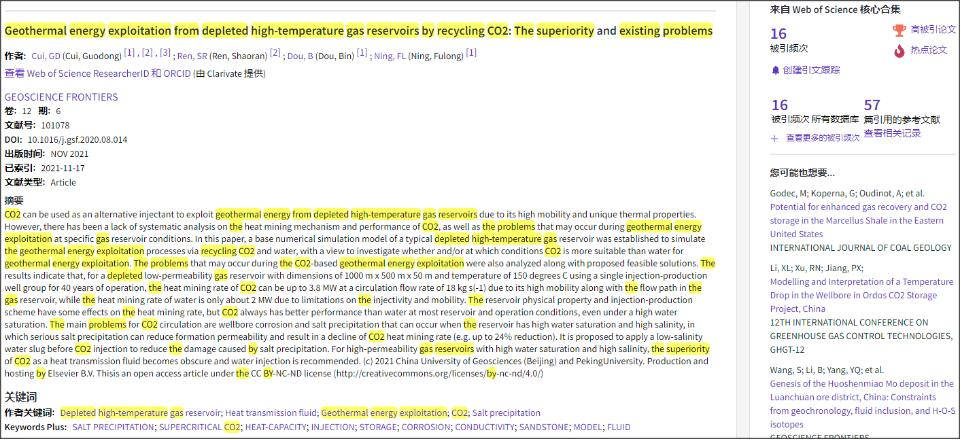 (通讯员:黄静)根据2022年3月基本科学指标数据库(Essential Science Indicators,简称ESI)最新数据显示,高清av 崔国栋副教授于2021年在国际地学期刊Geoscience Frontiers上发表的学术论文“Geothermal energy exploitation from depleted high-temperature gas reservoirs by recycling CO₂: The superiority and existing problems”入选ESI热点和高被引论文(Hot and Highly Cited Paper)。该论文第一作者兼通讯作者为崔国栋副教授,高清av (武汉)高清av 为第一署名单位。