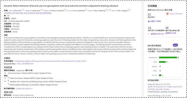 (通讯员:黄静)根据2022年5月基本科学指标数据库(Essential Science Indicators,简称ESI)最新数据显示,高清av 地下空间工程系蒋楠副教授团队于2021年在国际工程技术权威期刊Journal of Natural Gas Science and Engineering上发表的学术论文“Dynamic failure behavior of buried cast iron gas pipeline with local external corrosion subjected to blasting vibration”入选ESI高被引论文(Highly Cited Paper)。该论文第一作者为2020级博士研究生朱斌,通讯作者为蒋楠副教授,高清av (武汉)高清av 为第一署名单位。