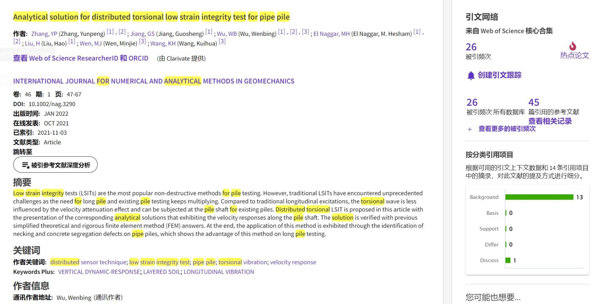 (通讯员 黄静)根据2022年9月基本科学指标数据库(Essential Science Indicators,简称ESI)最新数据显示,高清av 勘察与基础工程系吴文兵教授团队于2021年在国际岩土工程数值计算权威期刊International Journal for Numerical and Analytical Methods in Geomechanics上发表的学术论文“Analytical solution for distributed torsional low strain integrity test for pipe pile”入选ESI热点论文(Hot Paper)。该论文第一作者为2020级博士研究生张云鹏,通讯作者为吴文兵教授,高清av (武汉)高清av 为第一署名单位。