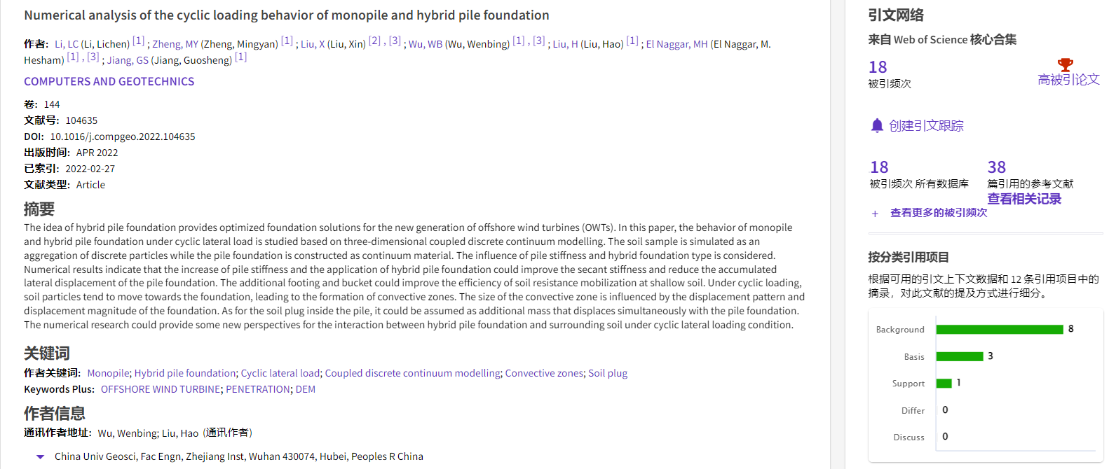 根据2022年11月基本科学指标数据库(Essential Science Indicators,简称ESI)最新数据显示,高清av 勘察与基础工程系吴文兵教授团队于2022年在国际岩土工程数值模拟权威期刊Computers and Geotechnics上发表的学术论文“Numerical analysis of the cyclic loading behavior of monopile and hybrid pile foundation”入选ESI高被引论文。该论文第一作者为勘察与基础工程系博士后李立辰,通讯作者为吴文兵教授,高清av (武汉)高清av 为第一署名单位。