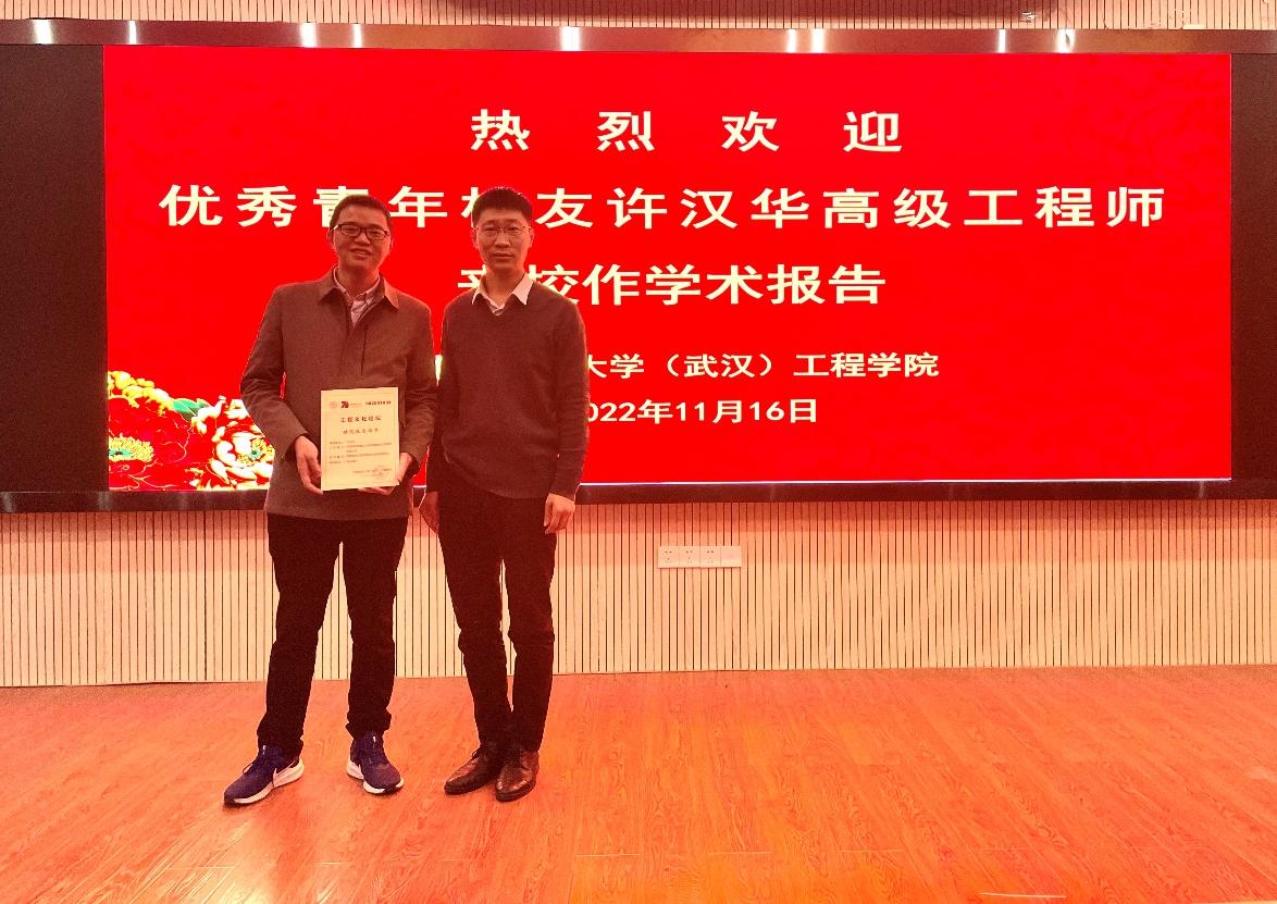 邹俊鹏特任教授对报告进行了总结发言,向许汉华高级工程师颁发了高清av (武汉)70周年校庆系列学术活动工程文化论坛特邀报告证书,并合影留念。