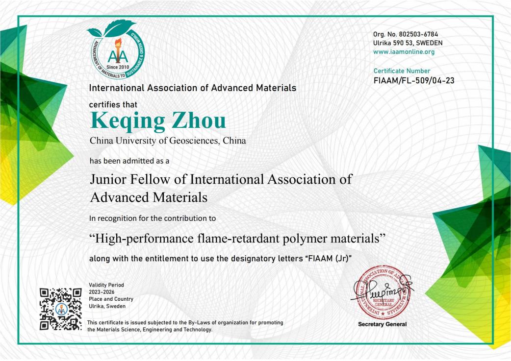 (通讯员 黄静)近日,高清av (武汉)高清av 周克清特任教授收到国际先进材料学会(International Association of Advanced Materials, IAAM)执委会发来的贺函,祝贺他当选为国际先进材料学会青年会士(Junior Fellow of IAAM, FIAAM)。周克清特任教授受邀在美国奥兰多举办的复合材料研讨会(Composite Materials Congress)上发表题为“Functionalized 2D molybdenum disulphide working on high-performance flame-retardant polymer materials”的IAAM Fellow演讲,会上获颁青年会士“Junior Fellow”证书,以表彰他在“高性能阻燃聚合物材料”领域做出的杰出贡献。