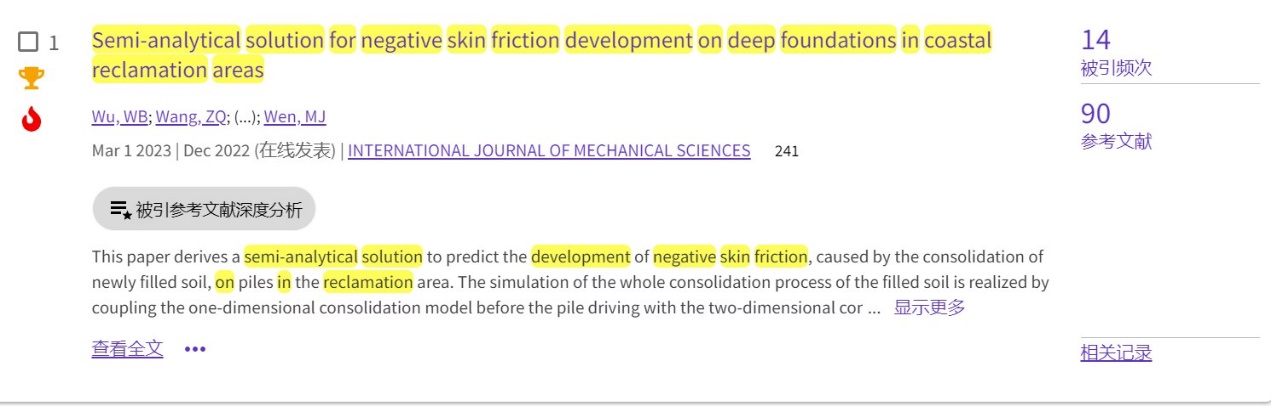 (通讯员 黄静)根据2023年7月基本科学指标数据库(Essential Science Indicators,简称ESI)最新数据显示,高清av 勘察与基础工程系吴文兵教授团队于2023年在国际工程力学领域权威期刊International Journal of Mechanical Sciences(IF: 7.3, 中科院一区TOP)上发表的学术论文“Semi-analytical solution for negative skin friction development on deep foundations in coastal reclamation areas”同时入选ESI热点论文和高被引论文。该论文第一作者为吴文兵教授,第二作者为勘察与基础工程系王宗琴硕士,高清av (武汉)高清av 为第一署名单位。