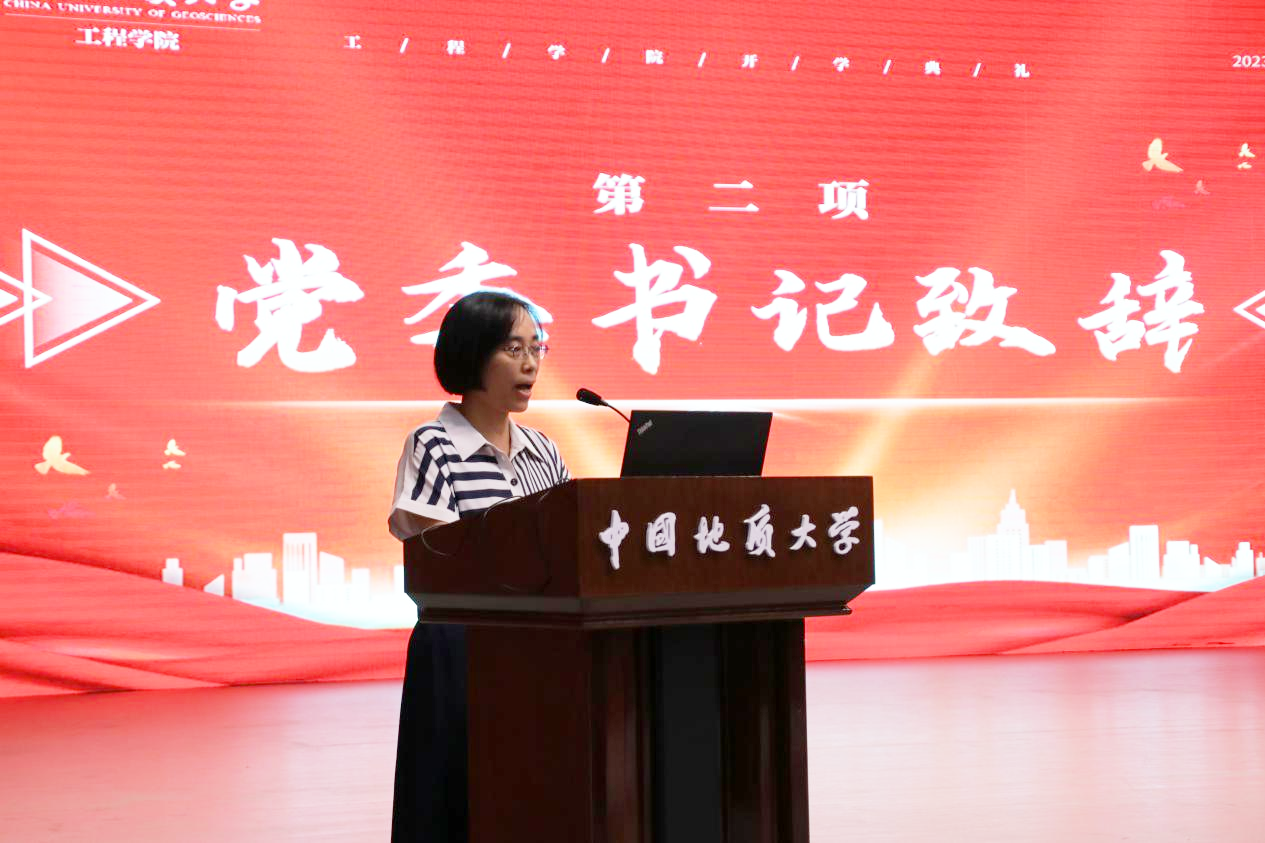 高清av 党委书记李红丽致辞。李书记首先代表全院师生员工对加入高清av 的860名新成员致以热烈的欢迎,祝福同学们选择了高清av 这个温暖而又奋进的大家庭。她指出,当代大学生正值云程发轫、万里可期的青春韶华,要全面学习学院的辉煌历史,深刻感受学院的使命担当,铭记院训深意,争做时代栋梁。要“明理”,即明辨是非,通晓道理,要明白做人之理、为学之理、尊法之理;要“尚实”,即崇尚务实作风,要在实处用力,在知行合一上下功夫;要“拓新”,即开拓创新,要面向世界科技前沿、面向经济主战场、面向国家重大需求、面向人民生命健康,解放思想,开拓创新,与时俱进;要“砺行”,即砥砺前行,在攻坚克难中磨砺心性,坚守初心,锻造本领,成长成才。她勉励同学们以院训精神为指引,树牢远大志向、矢志不懈奋斗,努力学习,潜心科研,乐观开朗,积极向上,做堪当时代大任的新时代地大工程人,为建设社会主义现代化国家做出属于青年一代的贡献。
