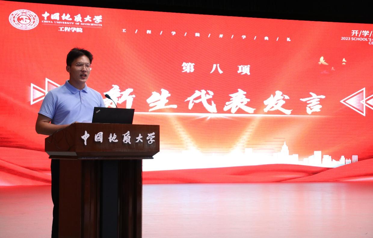 2023级05D231班张高涵同学作为本科生新生代表发言。他说,在长辈厚重岩土气息的熏陶下,自己终于如愿考进地质大学,加入高清av 。他对开学报到以来学院领导老师给予的教育关怀表示感谢,对军事训练当中空军预警学院教官对自己坚忍毅力和良好作息的打造由衷感激,他立志与其他505名本科新生同学一道,以强国建设、民族复兴的时代号召为号角,以“品德高尚、基础厚实、专业精深、知行合一”的成才目标为向导,直挂云帆,乘风破浪,早日成为德智体美劳全面发展的中国特色社会主义事业的建设者和接班人。