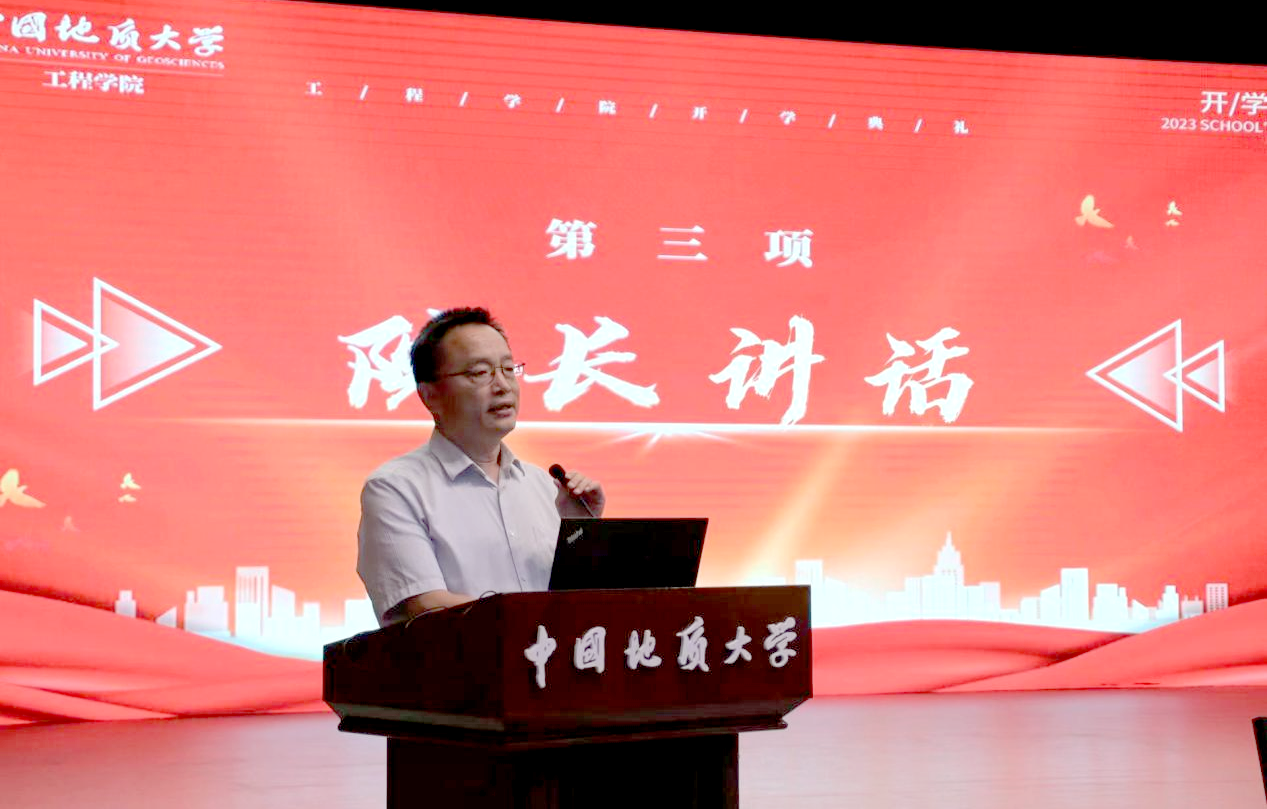 高清av 院长焦玉勇教授讲话。他以“祝贺”“欢迎”“希望”寄语新生,祝贺860位新生加入国家工程行业,欢迎同学们来到高清av ,为学院发展注入新鲜血液、增添奋进力量。他系统全面的向大家介绍了学院的历史沿革、系室设置、师资力量、学科建设、科学研究、国际交流等基本情况,勉励全体新生用习近平新时代中国特色社会主义思想凝心铸魂,用“艰苦朴素,求真务实”的校训精神和“明理尚实、拓新砺行”的院训精神领航前进,跟随学校学院的发展步伐,用好学校学院的发展平台,毅然投身于国家工程建设行业当中,迎难而上、奋勇前行,不负历史、不复时代,为把学院建设成为地质工程与人居安全领域特色鲜明、享誉国际的一流研究型学院不懈努力!