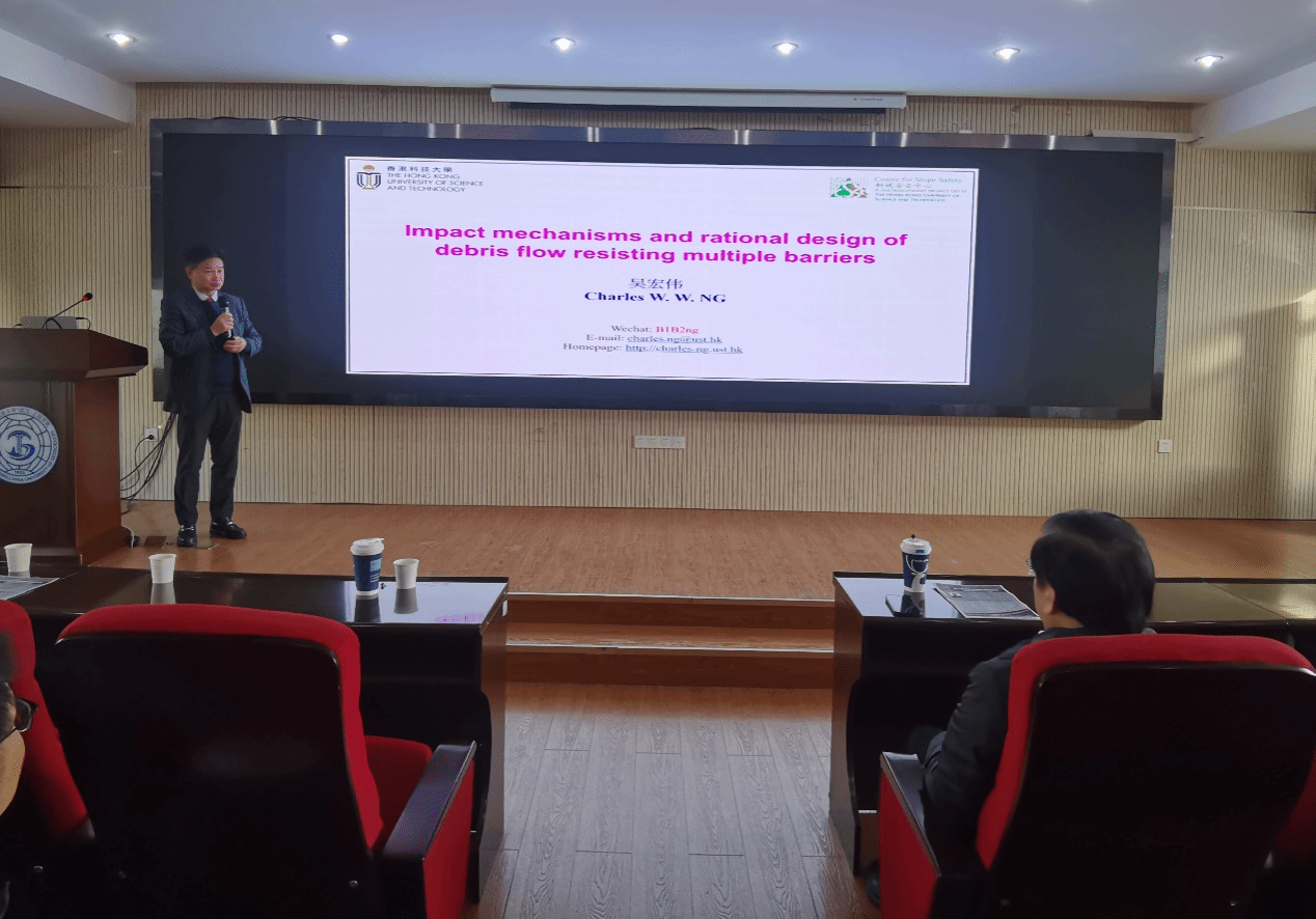 吴宏伟教授作了题为“Impact mechanisms and rational design of debris flow resisting mutltiple barriers”的学术讲座。吴宏伟教授首先介绍了香港科技大学的学科发展历史及国际排名等相关情况,欢迎高清av 同学前往香港科技大学进行联合培养,开展学术交流活动。随后,介绍其团队近年来在泥石流刚性和柔性屏障设计方面的水槽模型测试和数值模拟试验成果,揭示了典型泥石流对多重屏障的影响机制,为泥石流多重屏障设计提出合理建议。