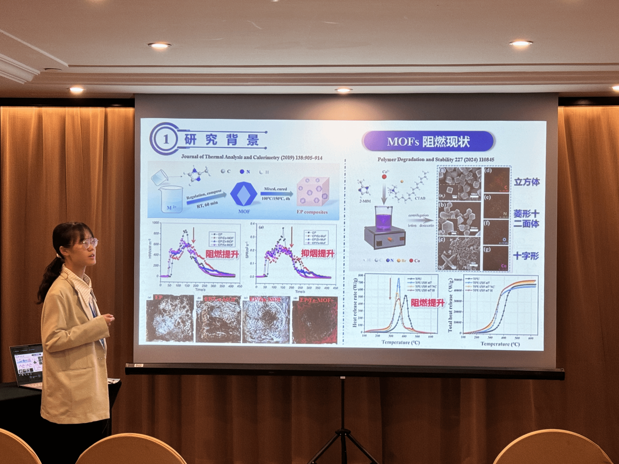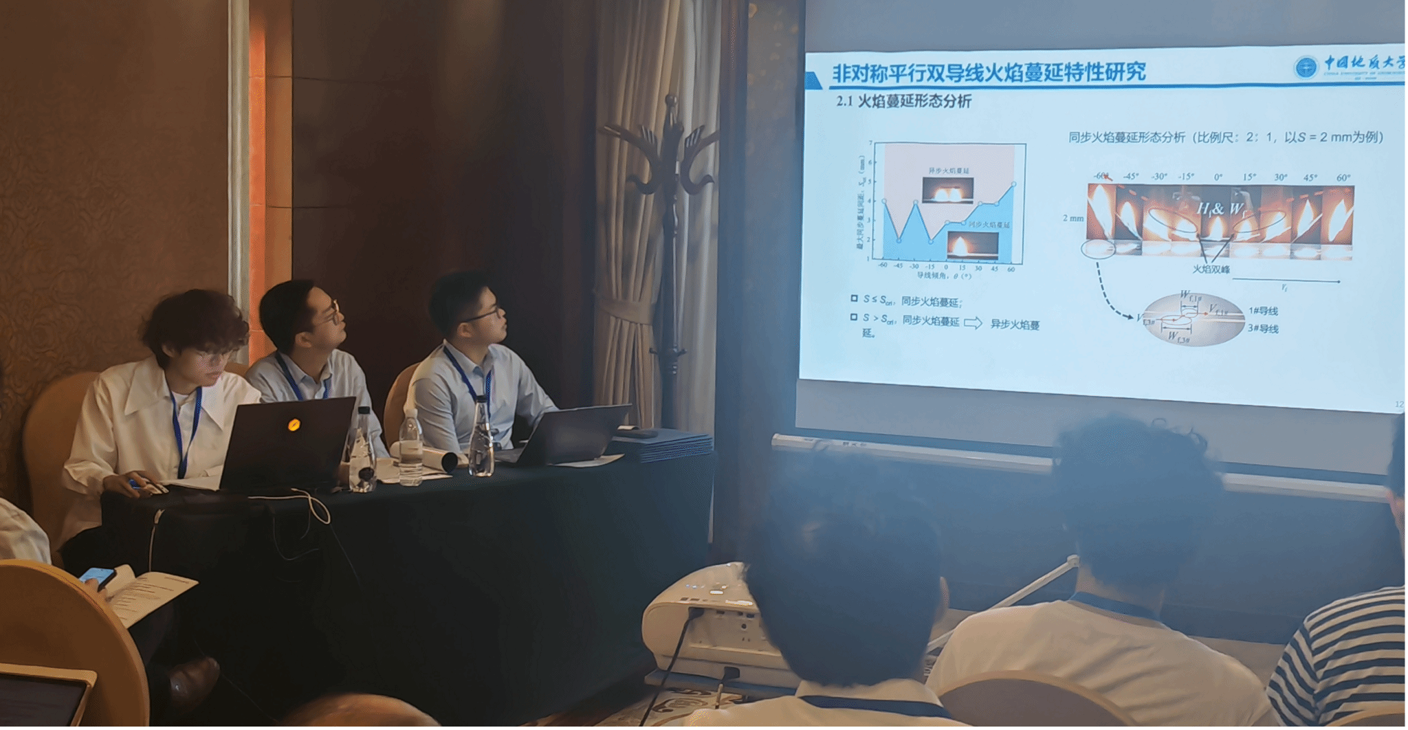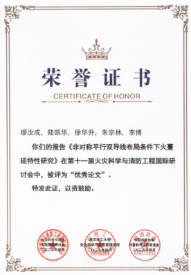 此外,高清av 研究生印恋在阻燃耐火论坛作题为“卟啉基有机框架衍生物分子设计及其阻燃增韧研究”报告、罗瑊瑊在阻燃耐火论坛作题为“生物启发微中空MOFs的界面锁定效应:环氧树脂复合材料的耐火与增韧性能优化研究”报告、缪汝成在火灾机理论坛作题为“非对称平行双导线布局条件下火蔓延特性研究”报告,孟祥龙在火灾烟气论坛作题为“空气幕射流作用下的开口溢流发展行为研究”报告,宗志伟在受限空间火灾论坛作题为“墙角型壁面限制条件下的火羽流行为特性研究”报告。其中,陆凯华副教授指导的硕士研究生缪汝成获得会议优秀论文奖。