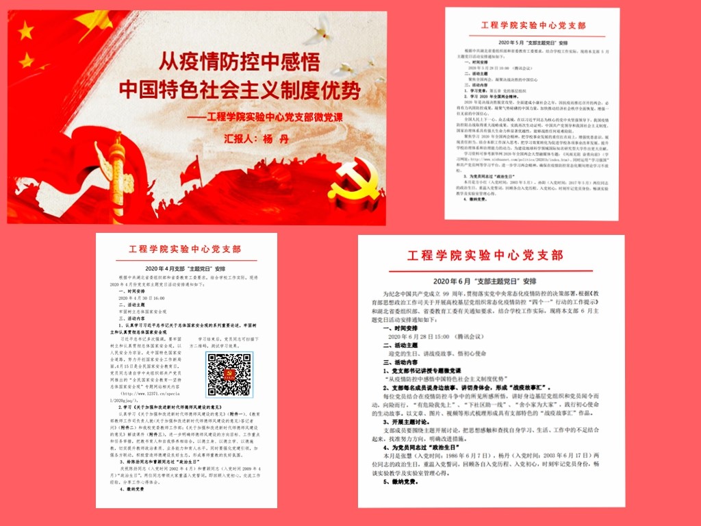 在抗疫情势好转回到武汉后,杨丹同志始终把宣传贯彻党的方针政策、落实抗击疫情各项举措放在首位,先后多次组织实验中心党员同志通过网络视频会议的形式,深入学习领会党中央方针政策和习近平总书记的讲话精神,编辑“从疫情防控中看中国特色社会主义制度优势”PPT文件,对实验中心党员统一思想,提高认识、凝聚力量、发挥党支部战斗堡垒作用有着重要意义。