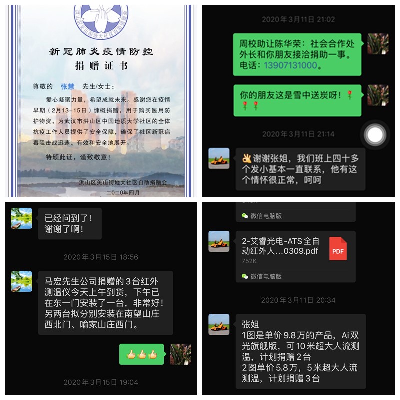 实验中心张慧同志是高清av 喻家山庄业主委员会主任。疫情爆发后,她迅速联系业委会委员,配合居委会发布通告,及时了解学校及小区居民的发病人员情况。在物业管理人员缺乏,小区消杀物资有限的情况下,组织成立业主自救小组,将业主中的医务人员充实到组织中来。借助学校物业管理的能力对小区的公共区域进行大规模的消杀.多方联系团购渠道,为小区居民提供了便利。进一步完善各楼栋单元的QQ群,摸清现在居住在小区的住户名单及家居人口数。在缺乏防护物质的前提下,不等不靠,组织业主捐款购买护防装备提供给医护人员,保卫人员,社区工作人员,物业管理人员及小区志愿服务人员。在张慧同志的带领和组织下,广大业主积极响应,共筹得善款十七万余元。同时,张慧同志联系到烟台睿创维纳技术股份有限公司的朋友,给高清av 捐赠了三台ITS智能红外体温检测设备,分别投入到学校东一门、南望山庄西北门和喻家山庄西门使用,大大提高了体温的检测效率和准确性。